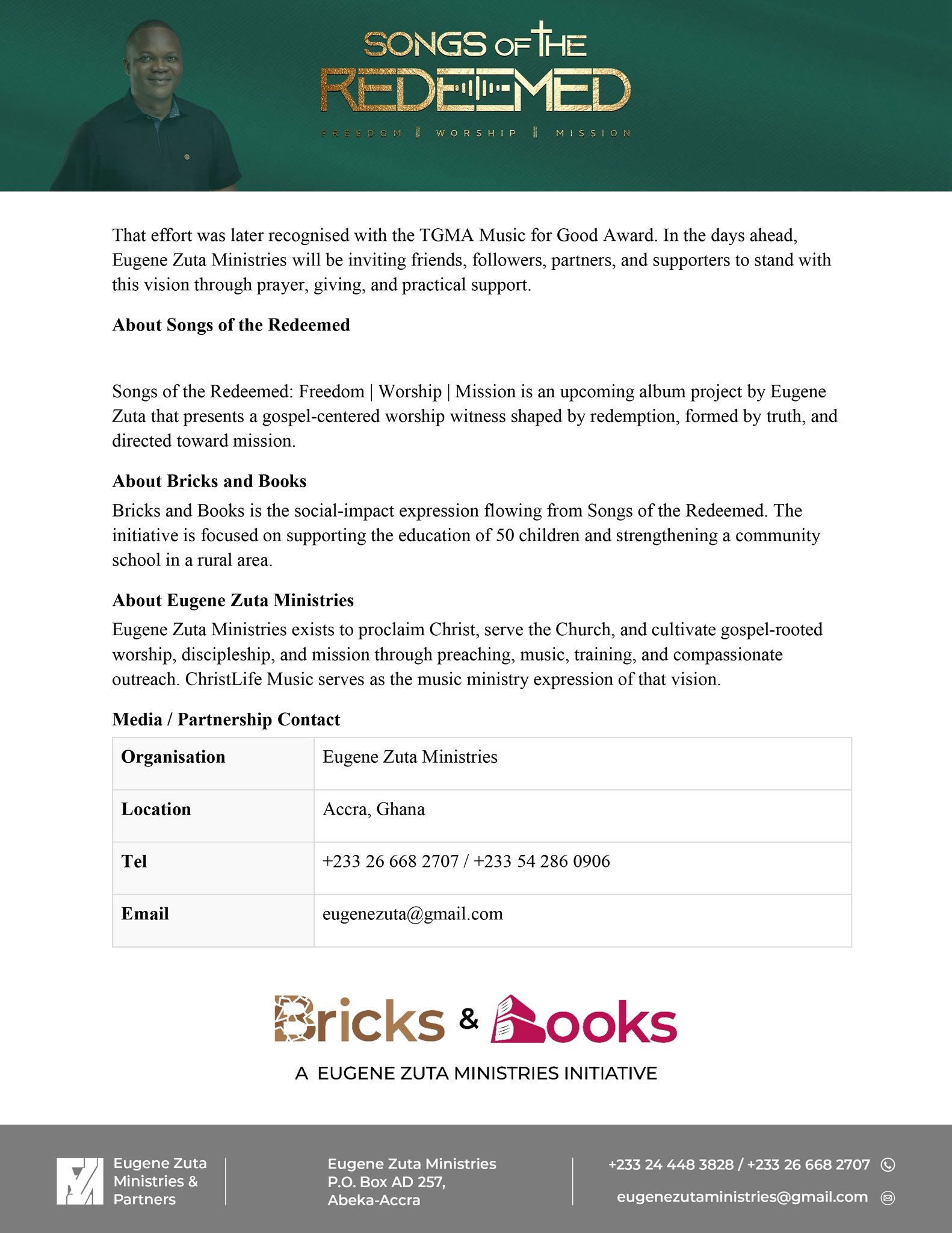 charity Christian Ministry education Eugene Zuta ghana Gospel Music missions social impact Songs of the Redeemed Worship