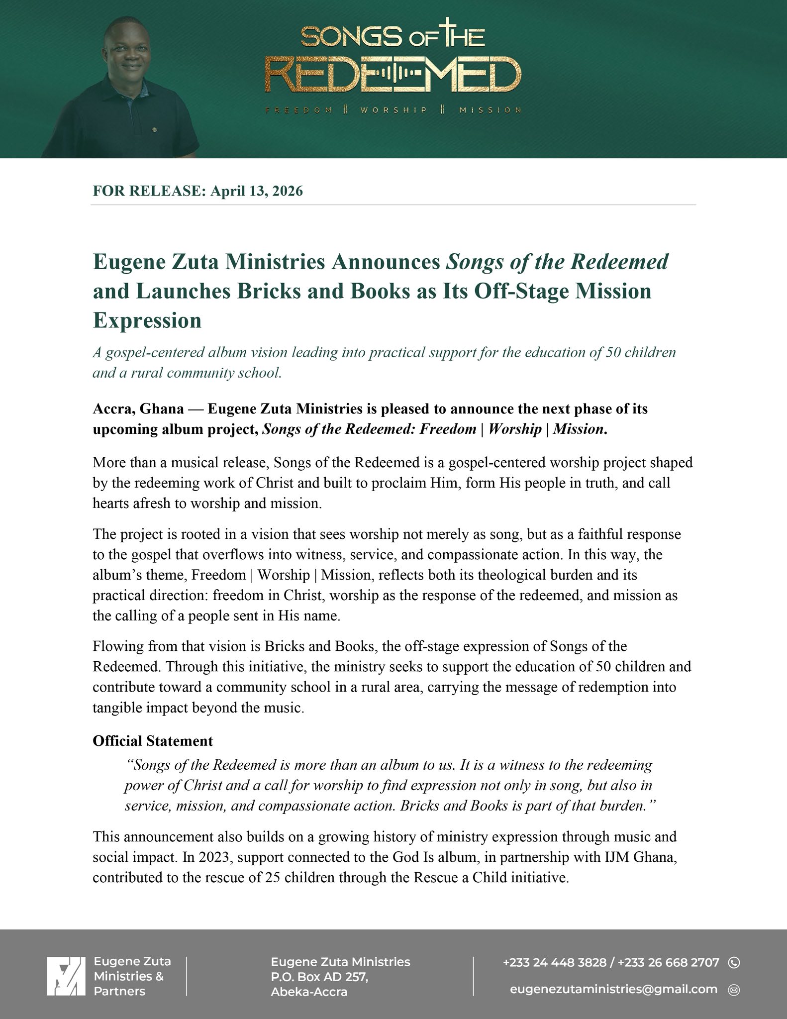 In a powerful fusion of worship and social impact, Eugene Zuta Ministries has unveiled its upcoming album Songs of the Redeemed: Freedom | Worship | Mission, set for release on April 13, 2026. But this is far more than music—it is a movement.